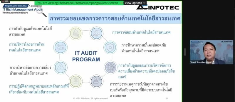 เมื่อวันที่ 23 กันยายน 2564 ที่ผ่านมา บริษัท เอซีอินโฟเทค จำกัด (ACinfotec) ได้จัดกิจกรรมสัมมนาออนไลน์ ในหัวข้อ “Preparing and Executing a Successful IT Risk Management Audit for Insurance Industry” การเตรียมความพร้อมสำหรับการตรวจสอบตามหลักเกณฑ์การกำกับดูแลและบริหารจัดการความเสี่ยงด้านเทคโนโลยีสารสนเทศของบริษัทประกันชีวิต/ประกันวินาศภัย ตามข้อกำหนดของ คปภ. นำโดยวิทยากรที่มีความรู้ ความเชี่ยวชาญด้าน IT Risk Management คุณสุวิทย์ ศิรสิทธิวรภัทร – Senior Consultant Manager และ คุณบรรณกิจ ศรีสวย – Senior Consultant Manager จาก ACinfotec ร่วมด้วยวิทยากรรับเชิญพิเศษ Mr. Adam Denyer-Hampton ผู้เชี่ยวชาญด้าน IT Security จาก SecurityScorecard ซึ่งเป็น Platform ชั้นนำด้าน Security Rating