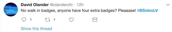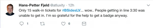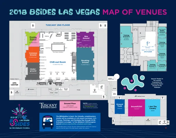 ปีนี้ BSidesLV จัดที่ Tuscany Suite ซึ่งอยู่ห่างจากถนนหลัก (Strip) ของ Vegas ไปนิดหน่อย ซึ่งความนิดหน่อยนี้อาจจะเดินแล้วเหนื่อยได้เนื่องจากหน้าร้อนในแถบทะเลทรายนี่ค่อนข้างโหดร้าย สำหรับตั๋วเข้างาน BSides นั้นเข้าใจว่าจะมีเปิดให้ Pre-Registerใครจะไปงาน BSides ต้องเตรียมตัวดีๆหน่อยเนื่องจากว่ามีโอกาสไม่ได้เข้าสูง เพราะว่าถ้าคนเต็มเค้าจะไม่ให้เข้า เหมือนอย่างเช้าวันนี้ ใน Twitter มีคนบอกว่ารอตั้งแต่เช้าแต่ไม่ได้เข้างาน เพราะว่ามี Walk-in ให้แค่ 10 กว่าคน