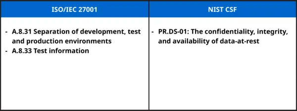 1.2 การใช้ข้อมูลในการทดสอบ: งดใช้ข้อมูลจริงในการทดสอบระบบหากมีความจำเป็นในการทดสอบให้ลบข้อมูลออกภายใน 3 วัน ซึ่งสอดคล้องกับมาตรการควบคุมตามมาตรฐาน ISO/IEC 27001 และ กรอบ NIST Cybersecurity Framework อาทิเช่น