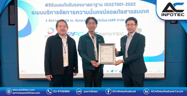 บริษัท เอซีอินโฟเทค จำกัด (ACinfotec) ขอแสดงความยินดีอย่างยิ่งกับ บริษัท ไออาร์พีซี จำกัด (มหาชน) (IRPC Public Company Limited) ในโอกาสได้รับมอบ Certificate มาตรฐาน ISO/IEC 27001:2022 จากบริษัท BSI (British Standards Institution) อย่างเป็นทางการ เมื่อวันที่ 2 ธันวาคม 2568