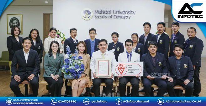 เมื่อวันจันทร์ที่ 9 มกราคม พ.ศ. 2566 ที่ผ่านมา ตัวแทนผู้บริหาร บริษัท เอซีอินโฟเทค จำกัด นำทีมโดย คุณต้นเดือน บุญยรักษ์โยธิน และทีมที่ปรึกษา ได้ร่วมแสดงความยินดีพร้อมมอบโล่อะคริลิกแก่ ดร.นพ.ทพ. ศิริชัย เกียรติถาวรเจริญ คณบดี คณะทันตแพทยศาสตร์ มหาวิทยาลัยมหิดล และคณะทำงาน เนื่องในโอกาสที่ได้รับการรับรองมาตรฐานระบบบริหารจัดการความมั่นคงปลอดภัยสารสนเทศ ISO/IEC 27001:2013 (Information Security Management Systems : ISMS) จากบริษัท บีเอสไอ กรุ๊ป (ประเทศไทย) จำกัด