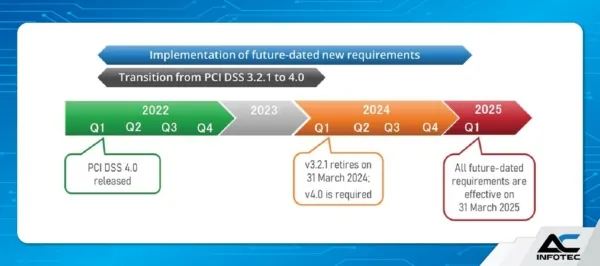 หลังจากวันที่ 31 มีนาคม 2024 การตรวจประเมินเพื่อออกรายงานรับรองความสอดคล้อง จะต้องอ้างอิงตามมาตรฐาน PCI DSS 4.0 เท่านั้น โดยยกเว้นเฉพาะบางข้อกำหนดที่เป็น Future-dated requirement จำนวน 51 ข้อ ใน PCI DSS 4.0 ซึ่งจะมีผลบังคับใช้ในอีกหนึ่งปี (31 มีนาคม 2025)